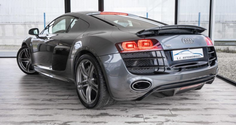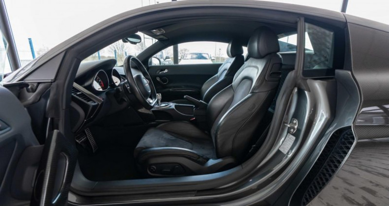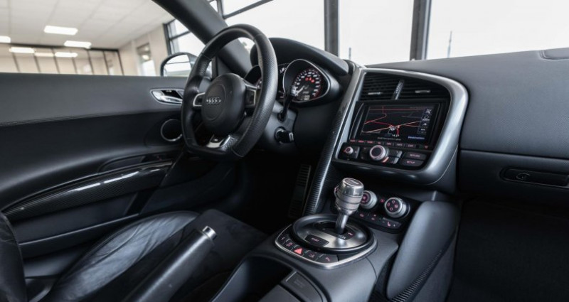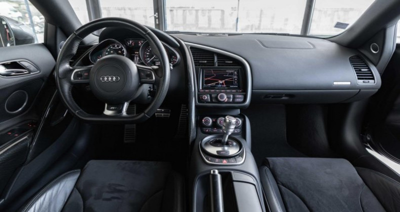 ======= options ======= applications décoratives en carbone sigma sur monoposto, habillage sur la console centrale, vide-poches de portières, poignée de porte côté passager compartiment moteur avec applications carbone sigma freins céramique plus endurants et résistants jantes en aluminium coulé style 5 branches doubles 8,5 j x 19? avec pneumatiques 235 35 r 19 à l'avant et 11 j x 19? avec pneumatiques 295 30 r 19 à l'arrière parking system plus avec caméra de recul : signal acoustique et visuel d'aide au stationnement avant et arrière avec caméra de recul permettant de visualiser l'arrière du véhicule sur l'écran couleur du mmi. sellerie alcantara et cuir sellerie cuir alcantara audi exclusive seuils de portes audi exclusive éclairés par led, avec baguette en aluminium et inscription r8 sideblades carbone sigma ======= equipements de serie ======= 3ème feu stop arrière abs : système antiblocage avec répartiteur électronique de freinage ebv et amplificateur hydraulique de freinage airbags frontaux grand volume côté conducteur et passager avant avec 2 stades de gonflement suivant la gravité du choc airbags latéraux (tête thorax) à l'avant, intégrés aux dossiers des sièges ; en cas de déclenchement d'un airbag, le système déverrouille les portières, allume l'éclairage intérieur, active les feux de alarme antivol incluant protection volumétrique de l'habitacle et protection antiremorquage par capteur d'inclinaison désactivable applications décoratives gris micrométallique appuie-tête actifs réglables en hauteur asr (antipatinage) pour une motricité et une rigidité transversale optimales assistant de démarrage en côte audi backguard audi magnetic ride : suspension adaptative pilotée par champ magnétique audi premium tracking system : système de localisation et d'immobilisation par satellite couplé à l'alarme antivol avertisseur deux tons sur le moyeu du volant badge v10 sur les ailes avant bang & olufsen sound system : 465 watts, 12 haut-parleurs. subwoofer de 130 mm dans un caisson bass reflex boîte à gants verrouillable et éclairée avec rangement pour lunettes calandre singleframe laquée noir brillant calandre spécifique : cadre laqué noir, grille avec baguettes horizontales et verticales chromées carrosserie à architecture audi space frame (asf) ; innovante combinaison ultra rigide d'aluminium et de magnésium améliorant le dynamisme et la stabilité ceintures de sécurité trois points à enrouleur avec prétensionneurs pyrotechniques, limiteurs de tension et réglage en hauteur cendrier et allume-cigares sur la console centrale changeur 6 cd sous l'espace de rangement derrière les sièges châssis sport avec ressorts et amortisseurs à réglage plus dynamique chauffage des sièges conducteur et passager ciel de pavillon en tissu noir ou gris lumière climatisation automatique, sans cfc, avec réglage asservi à la position du soleil ; régulation électronique de la température, du débit et de la répartition de l'air ; position embouteillage et circuit fermé, filtre à charbon actif cockpit de type monoposto : arche entourant la casquette d'instrumentation et se prolongeant sur la portière conducteur et sur la console centrale colonne de direction de sécurité, complète le potentiel de protection de la ceinture et de l'airbag ; réglable mécaniquement en hauteur et en profondeur contrôle de la pression des pneumatiques détecteur de pluie et allumage automatique des projecteurs déverrouillage du capot moteur, de la malle avant et de la trappe à carburant depuis la place conducteur diffuseur et extracteur d'air arrière spécifiques laqués noir direction assistée électromécanique ebv : répartiteur électronique de freinage Éclairage intérieur à led à temporisation avec contacteurs sur les deux portières eclaireurs et catadioptres sur toutes les portières Écrous antivol, ne s'enlèvent qu'à l'aide de l'adaptateur fourni eds (blocage électronique de différentiel) essuie-glace deux vitesses avec commande automatique extensions de bas de caisse latérales extracteurs d'air style aluminium à droite et à gauche du capot moteur feux antibrouillard arrière feux arrière entièrement à diodes, feux stop, troisième feu stop, clignotants, feux arrière et feu arrière de brouillard sous verre transparent, feux de recul et clignotants blancs feux de jour à led fixation pour siège enfant isofix côté passager avant, support pour fixation de siège enfant suivant norme iso frein à main mécanique freinage : étriers fixes à huit pistons à l'avant et à quatre pistons à l'arrière, cartographie de servofrein adaptée, disques de freinage ajourés et ventilés à l'avant et à l'arrière, en deux par gps plus : système de navigation gps grille de boîte de vitesses manuelle en h, en acier inscription r8 à l'arrière du véhicule et sur le compte-tours instrumentation de bord spécifique v10 instrumentation r8 spécifique gris micrométallique à éclairage réglable lave-phares haute pression livre de bord avec étui en alcantara lunette arrière dégivrante avec minuterie et antenne de vitre intégrée moquette et tapis complémentaires en velours, couleur assortie à celle de l'habitacle moulures de seuils de portes avec insert d'aluminium et inscription r8 outillage de bord dans le coffre pack eclairage pare-brise athermique en verre feuilleté avec bande grise sur la partie supérieure pare-chocs enrobés de synthétique dans la couleur de la carrosserie pare-soleil rabattables et pivotants, côtés conducteur et passager avant, avec miroir de courtoisie occultable pédalier et repose-pied style aluminium plafonnier à temporisation avec contacteur sur toutes les portières ; éclairage côté passager avant et dans le coffre plaque d'identification v10 en carbone sigma sur le moteur pommeau de levier de vitesses en aluminium avec anneau décoratif style aluminium porte-boissons, double dans la c